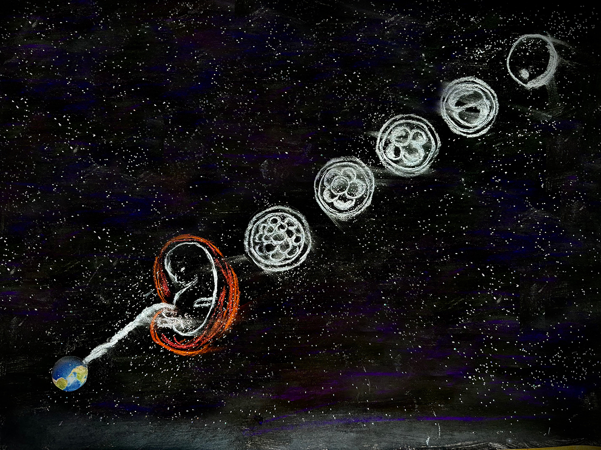 子宮のポータルを意識していたら、今度はわたしが赤ちゃんになっていった。小さな生まれたての赤ちゃんに戻ったと思ったら、わたしはお母さんのお腹の中に戻った。あたたかくて安全な子宮の中でわたしは小さく丸まった。そして、丸まったわたしはどんどん小さくなりはじめた。胎児から胚になり、受精卵になった。受精卵は細胞分裂を逆再生しはじめた。子宮への愛で涙が止まらない中、一部始終を観察している自分もいて、(すんげーなこれ!)って冷静に見ている。細胞分裂逆再生が終わりとうとうミクロな卵になってしまったわたしは、突然子宮の中からぷしゅーーーーーーって宇宙空間に放り出された。