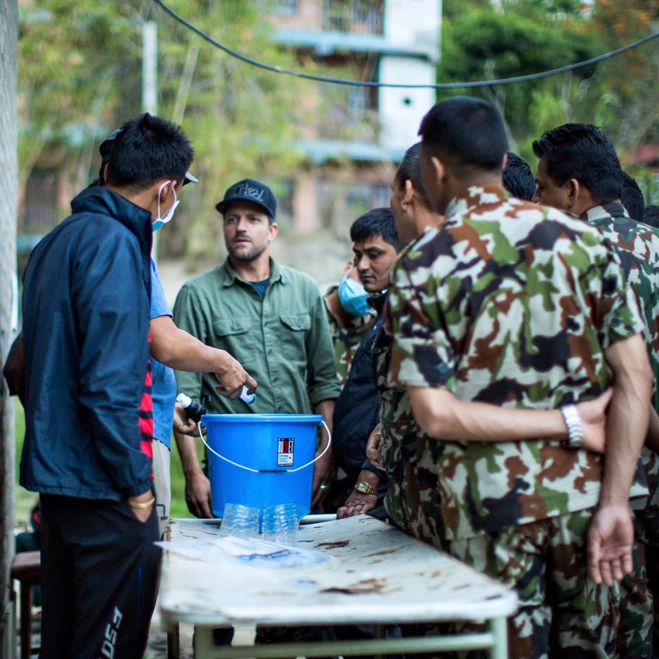 ネパール軍との浄水プログラムを立ち上げた。カトマンズ周辺の軍の病院すべてに浄水システムを設置した。このエリアの病院は災害被害者が大量に運び込まれており、きれいな水の確保が最大の問題となっている。ケガの洗浄などはもちろんだが、病院周辺の屋外でテント生活をおくっている地元のボランティアスタッフの飲み水といった、基本的な水の供給がまったく足りていないのだ。このプロジェクトの創始者、ジョン・ローズが浄水器の使い方のトレーニングを行うと、軍医と地元のスタッフたちは喜びに目を輝かせていた。「助けるものを助けよ」これはぼくらの理念のひとつでもある。今日ぼくらが行ったことは、この理念を明確にあらわしたものだった。