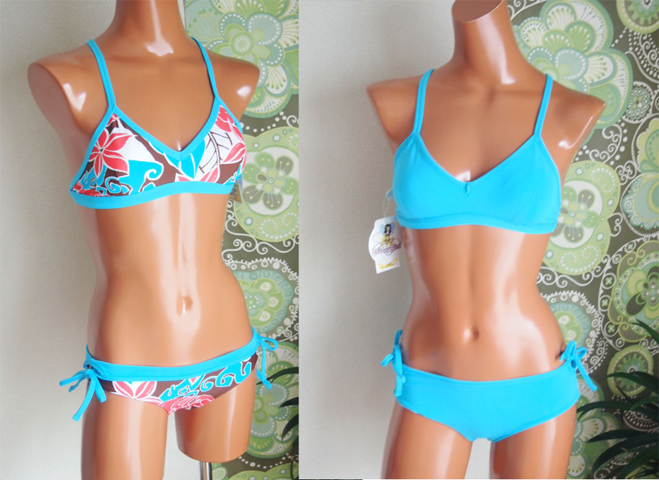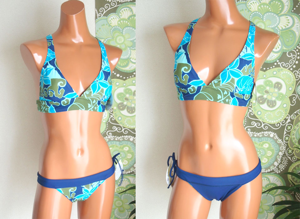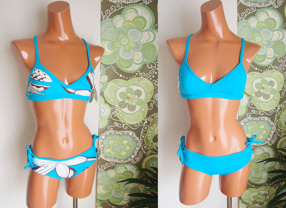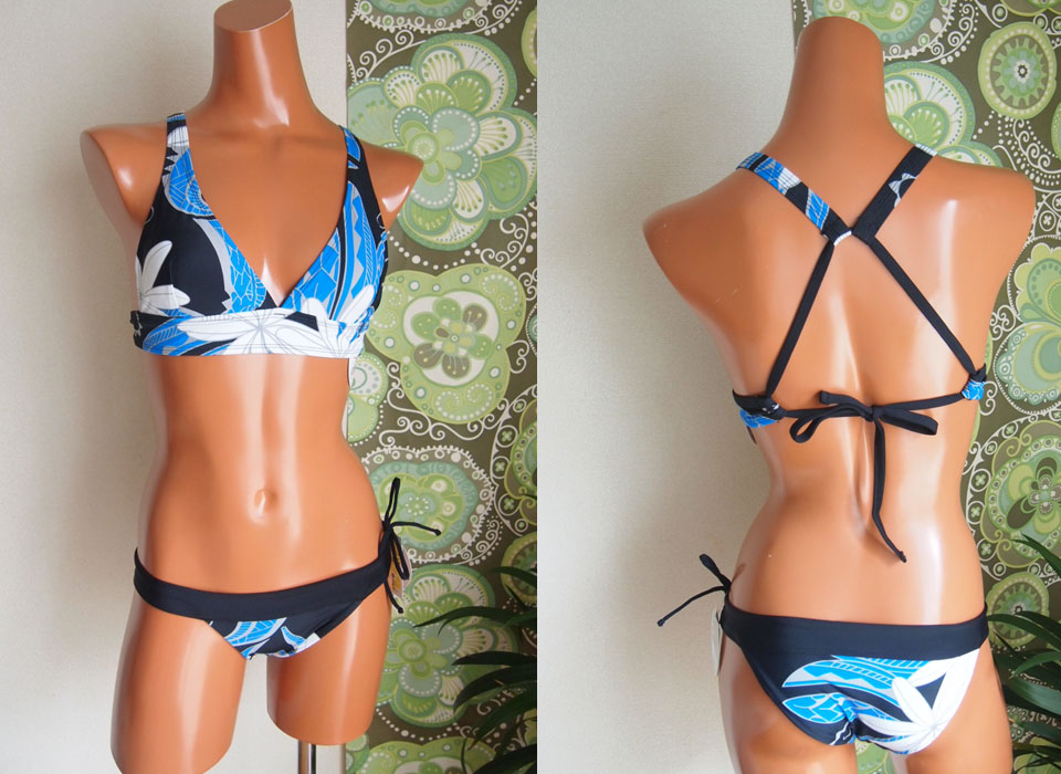 それから、こちら、究極の着心地を追求したSushi Sport Triangle。このトップは、おっぱい大きい人にも小さい人にも人気です。肩にかかるストラップが太いので、まったく疲れないですし、アンダーバストをしっかりサポートしてくれるので、おっぱい大きい人にはホールド力を、小さい人には、ずれ上がってくる心配がありません。ボトムは定番人気のHeather Bottom。ローライズで腰回りをすっきり。ウェストは巾着状になっていて、中に通してある紐をしっかり締めれば、相当ドでかい波くらっても脱げないです!まぢで。「えーー!脱げてない!」みたいな感じです。こちら、色は、Tahiti Nuiプリントのブラック。